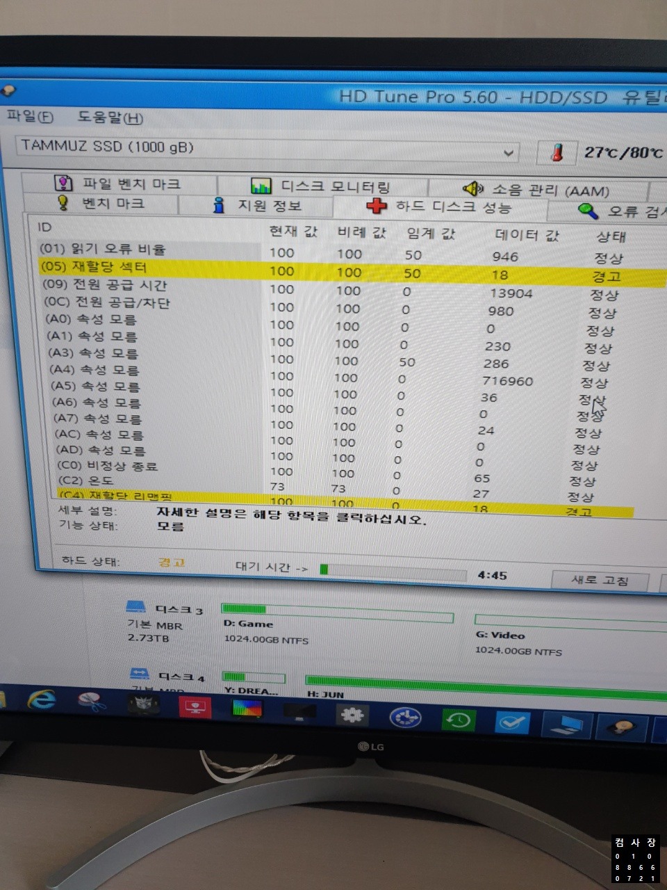 타무즈 SSD가 불량이네요.